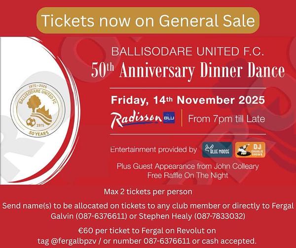 Ballisodare United FC 50th Year Anniversary Dinner Dance takes place Friday 14th Nov in the Radisson Blu Hotel, Sligo. π πΊ